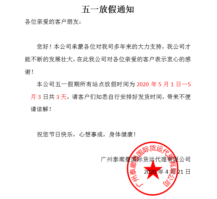 泰廊曼2020年五一放假通知