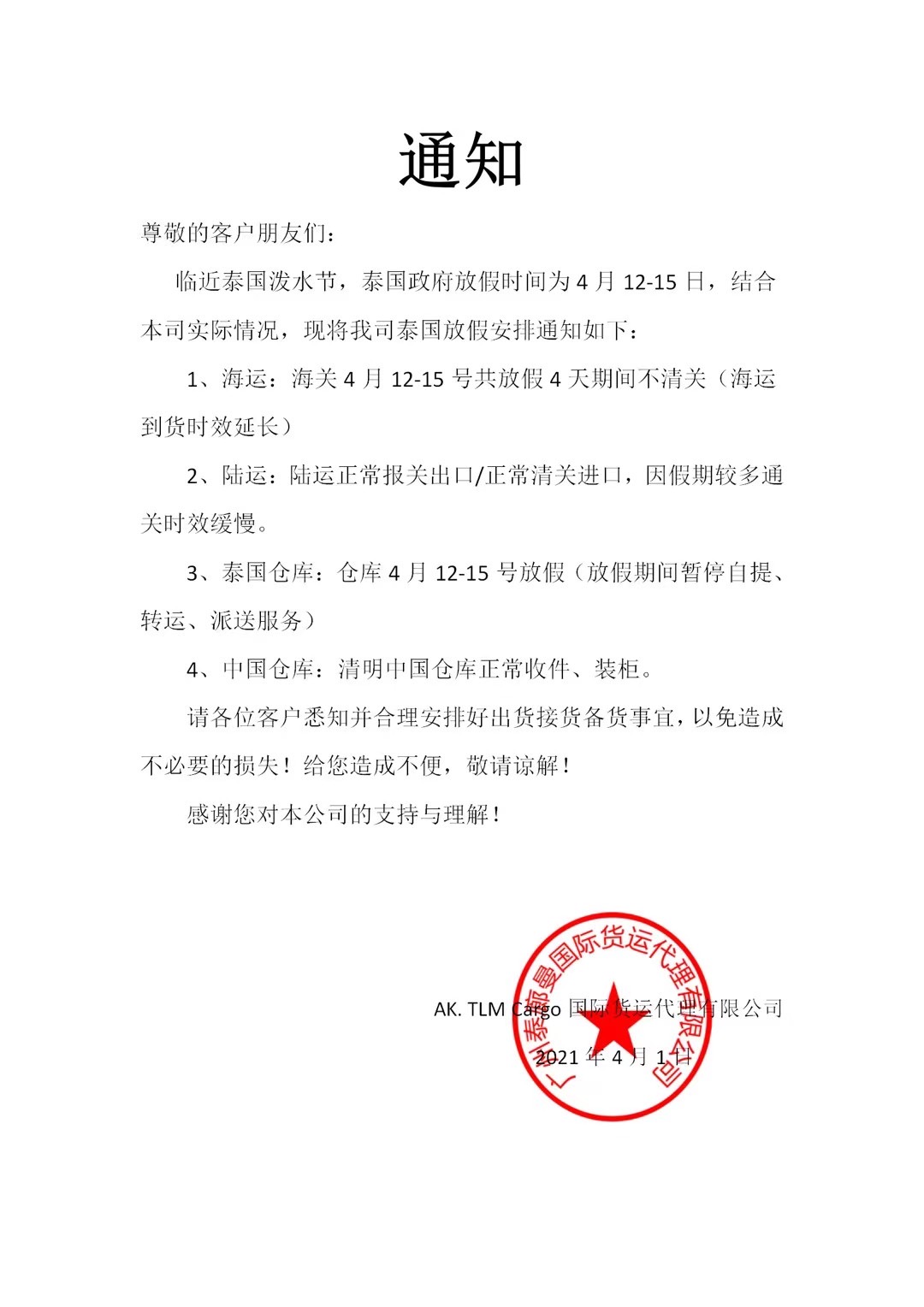 3、泰國倉庫:倉庫4月12-15號放假(放假期間暫停自提、轉(zhuǎn)運(yùn)、派送服務(wù))